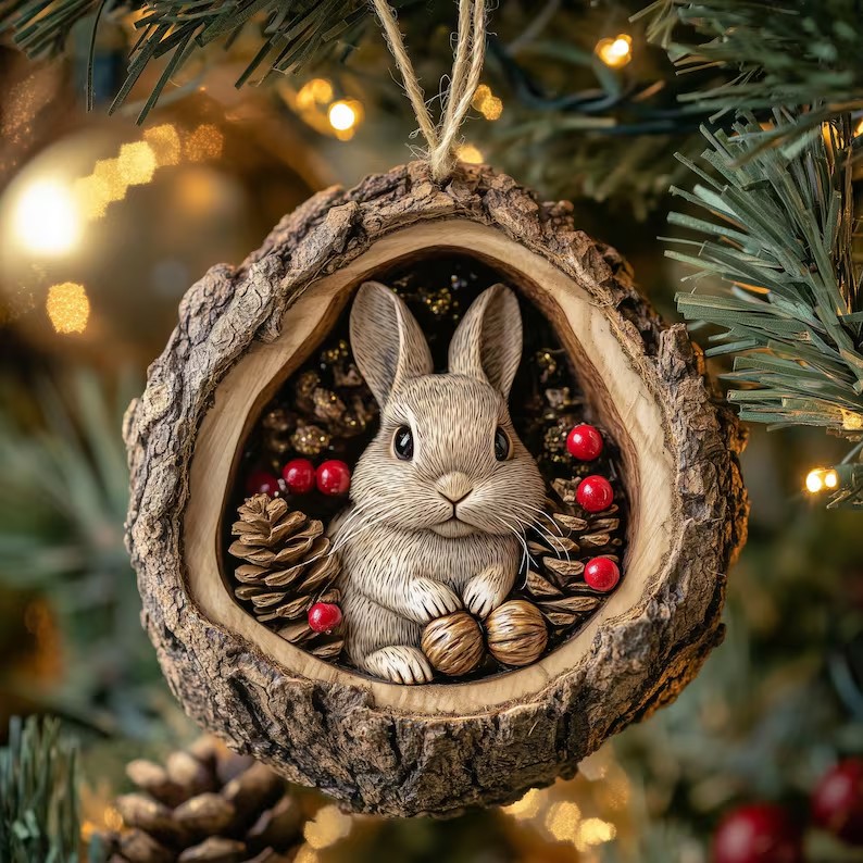 Each ornament depicts a sleeping little forest friend—a squirrel, fox, owl, bird, bunny, or hedgehog—quietly tucked inside a realistic acorn shell. Beautifully handcrafted with intricate details and warm, natural tones, these ornaments will add a touch of warm, rustic charm to your Christmas tree or cozy home decor.